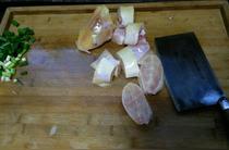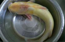 | 1.鮰鱼洗干净切块,然后在80度左右的水温中加入葱姜料酒后倒入鮰鱼烫两分钟,捞出,用钢丝球擦去鱼表面上的粘液,然后洗干净。 |