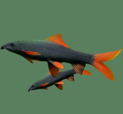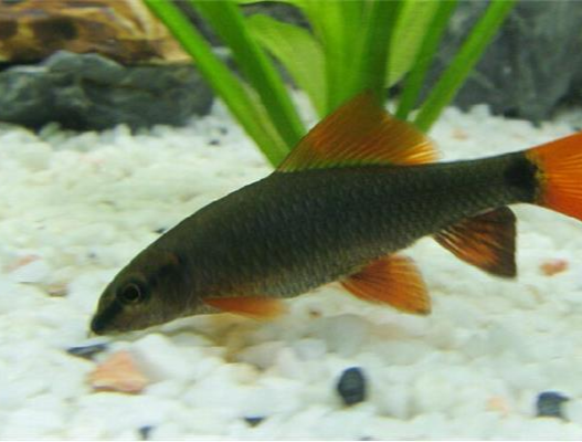 鱼身长8~10厘米。幼鱼尾鳍也成黑色,随着成长变成金黄色,接近成鱼时变成火红色。红尾黑鲨适宜水温22度以上。对水质要求不严格,但要有水草、砂石、少光而水体宽大的环境。杂食性,低息生物、青苔、藻类、切碎烫过的菠菜叶、人工配和饲料等,他都摄食。有领地观念,如许多尾饲养于同一箱后,强者占领摄食栖息的有利地盘后,弱者休想进入。所以,不宜同种群养;不与小鱼混养,可以和其他大小相同的鱼混养。如水环境不宜,营养不良,尾鳍的颜色会变浅或返黄。