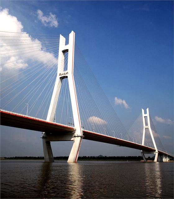 建筑结构军山大桥包括主桥,过渡孔桥,引桥,引道等部分,是一座五跨连续半飘浮体系双塔双索面钢箱梁斜拉桥,全部采用全焊接流线形扁平钢箱梁,主桥索塔采用分离式倒“Y”型,主塔塔身为花瓶型薄壁墩,线型简洁流畅;过渡孔桥及引桥上部结构均为双向预应力混凝土连续箱梁结构,采用逐跨现浇施工。