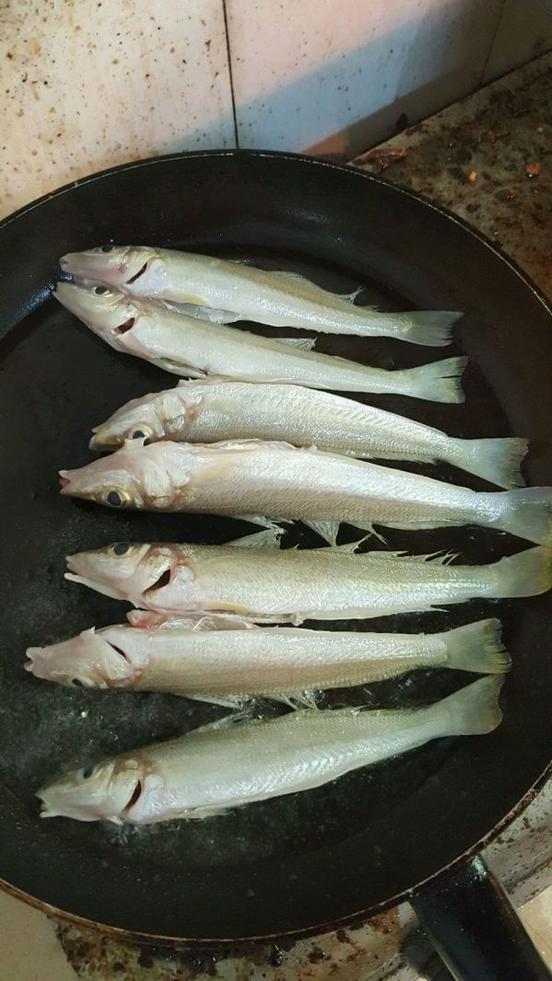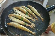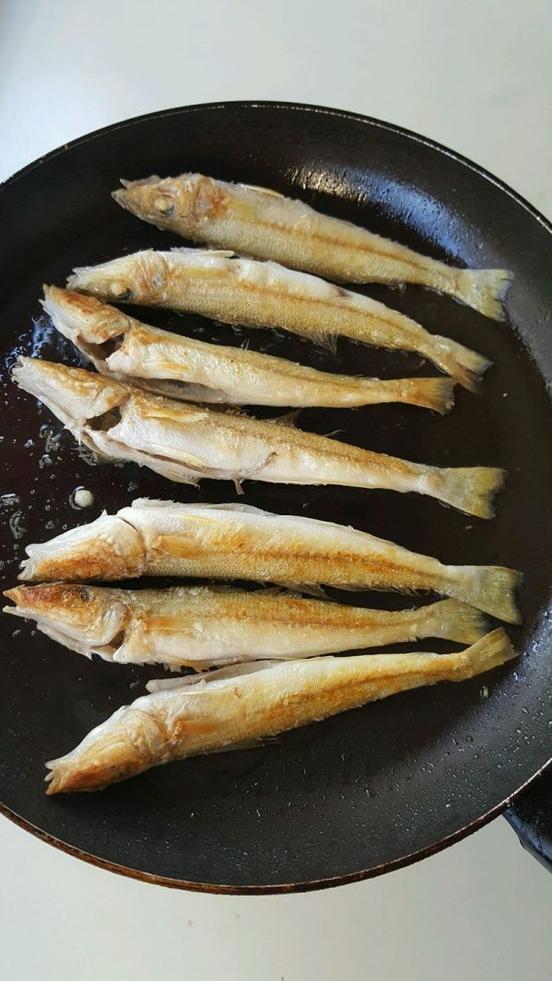 | 3.锅热下油,下鱼儿,煎至一面金黄,小心翻面 |